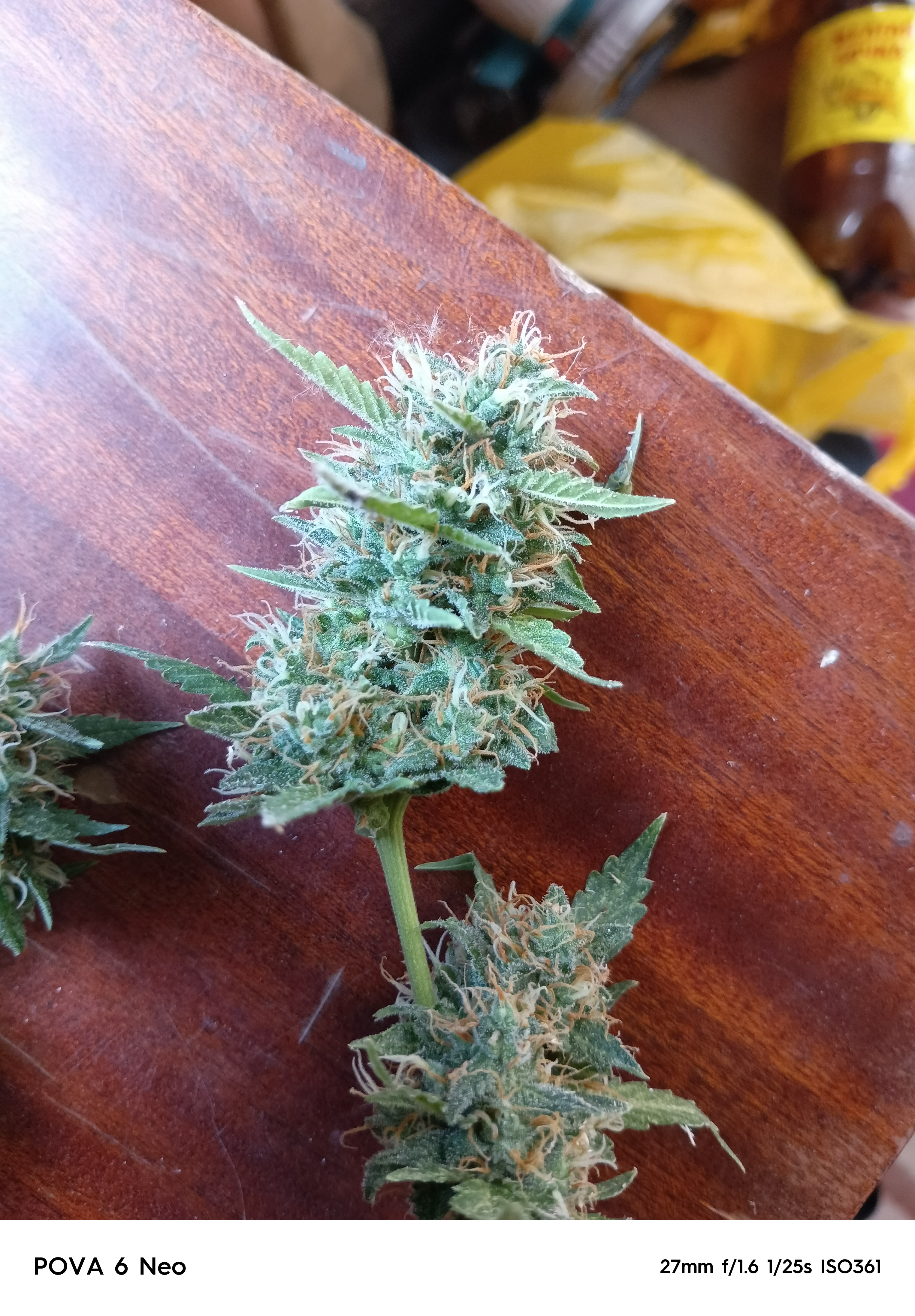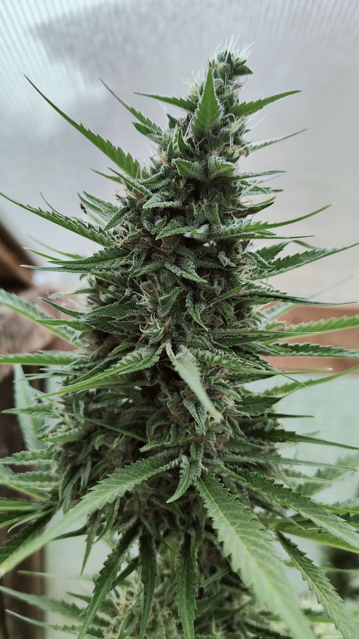 Куст сативной структуры, весь усыпанный завязями соцветий, а листва при этом редкая, что дает растению хорошую продуваемость и плесени можно не бояться, да и само растение имеет отличный иммунитет к плесени и другим болезням, созревает быстро, шишки в начале стают пышными, а под конец цикла набирают плотность, снимал урожай на 100 дне, когда было много янтарных трихом(для присутствия седативного эффекта), и добился чего хотел, прет как индика и в тоже время можно хорошо посмеяться.