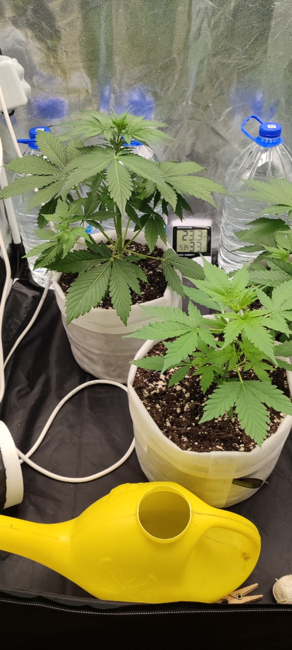 На фото 28 дней от прорастания🥺.Полил гуматом для укрепления корней и роста,уехал на много,бате сказал,поливай дважды в неделю,лампа на 160вт🤫Ближний мешок,там подарочная мороженка гелатто🤭,ох и намучился с ней,с трудностями мы пробивались в жызнь😌,25 дней примерно ей.Генетика понравилась,отличный Сид бак