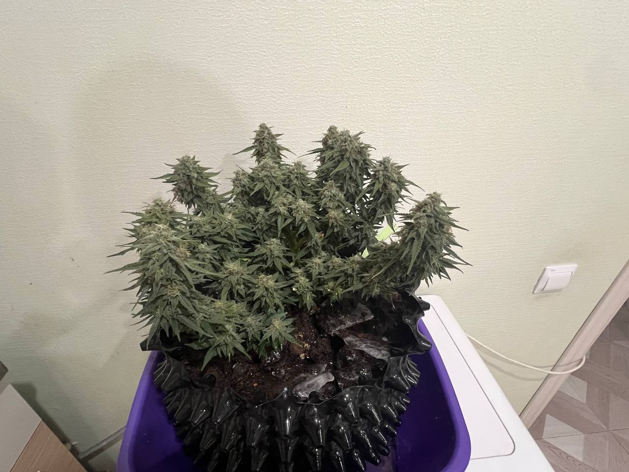 Это был мой первый гров, и куст поменял 2 домика, вегетация у него прошла в гроубоксе 40х40 и лампой 120 вт, а потом пересадил в в 60х60 и лампа 180 вт (поэтому он получился такого невысокого роста) Куст получился пышный весь в шишках! На фото посторался показать все стадии роста. Магаз топ, буду заказывать ещё!
